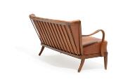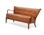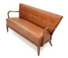 Sofa af bejdset bøg, betrukket i sæde og ryg med brunt læder. Model 93. Udført hos Slagelse Møbelværk. 1940'erne. L. 150.