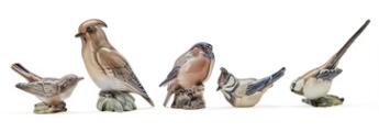 Five porcelain figures in the shape of birds, decorated in underglaze colours. 1242, 1243, 1233, 1050, 1059. Dahl-Jensen. H. 6–13.5 cm. (5)