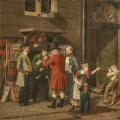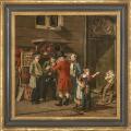 “Gadescene”. Parti fra en gade i Holsten, hvor en fornem herre køber et lommeur, mens en ung pige truer ad en gadedreng, der har hevet hatten ned over hovedet på en lille dreng i stadsetøjet. Usigneret. Olie på lærred. 44 × 44. Damborgramme med etiket.