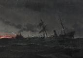 A lifeboat on the way to a sinking ship. Signed and dated Holger Drachmann, 77. Oil on canvas. 28×39 cm.