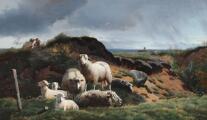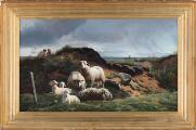 Kystparti med får og børn i klitterne. Sign. Simon Simonsen 1875. Olie på lærred. 46×78.