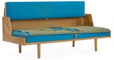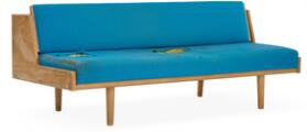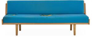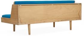 “GE 6” Daybed af eg med opklappelig ryg. Senere betrukket med blå uld. Udført og mærket hos Getama, Gedsted. L. 196.