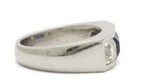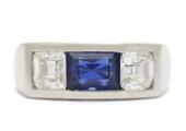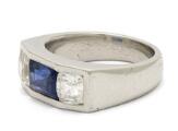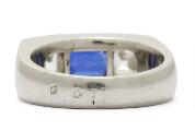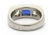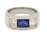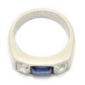 Safir- og diamantring af platin prydet med facetslebet syntetisk safir flankeret af to fancy-cut diamanter. Farve: H-I. Klarhed: VS-P1. Vægt ca. 14 g. B. 7,5 mm. Str. 53.
