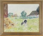Markparti med græssende ko. Signeret SSw. Olie på lærred. 47×59 cm.