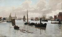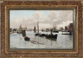 Busy traffic in Copenhagen Harbour. Signed Chr. Blache. 58×95.5 cm.