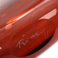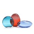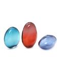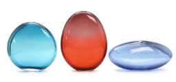 A red glass vase. Signed Trine. A blue glass vase. Unsigned. And a clear glass with inlaid blue and violet spiral. Signed TD. H. 11.5–22.5 cm. (3)