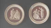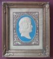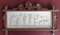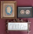 Portræt af Thorvaldsen samt to rammer med værker efter Thorvaldsen. Congreve tryk i bobinetramme. Biscuit fra Kgl. Porcelænsfabrik samt to Ipsen terrakotta platter. 18×24–21×38. (3)