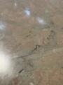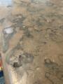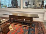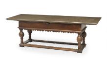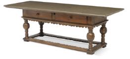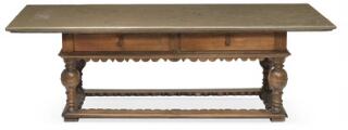Stort svensk stenbord med plade af Ölandsten, underdel af egetræ, front med to skuffer og tunget sarg, balusterformede ben, hvor imellem fodliste. Barok form, ca. 1850. H. 77. L. 230. B. 84.