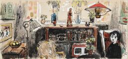Interior, 62. Signed Max Müller. Indian ink and watercolor on paper. Visible size 11.5×25 cm.