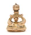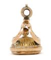 Signet af guld og forgyldt metal, rektangulær bund med runde hjørner, prydet med en karneol og skåret med våbenskjold, ophæng som bladværk og tøndeformet øsken til at hænge i en chatelaine. 19. årh. H. 4 cm. B. 3 cm.