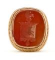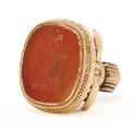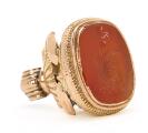 Mindre alders- og brugsslitage, inkl. få og små ridser i karneol samt enkelte afslag på guld-indramning af samme. Øksen og bladværk målt til 4,5 kt. guld, den rillede top over karneolen målt til forgyldt metal, bund og karneolens indramning målt til 18 kt. guld.