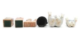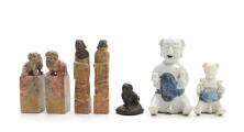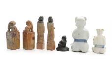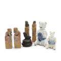 Collection of Chinese objects, consisting of larger and smaller stoneware figurines of laughing boys with underglaze blue belly belts, seated with attributes, two soapstone seals carved with foo dogs, a pair of inverted soapstone figures in the form of scholars standing with fly-whisk, and a patinated metal figure/lid in the form of a foo dog, raised on a small wooden base. 19th-20th century. H. 4.5–11 cm. (7)