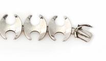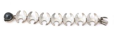 Armbånd af sterlingsølv sammensat af organiskformede led. Lås isat cabochonslebet hæmatit. Dessin 130. L. 19,5 cm. Georg Jensen efter 1945.