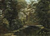 View from a forest lake. Signed P. C. S. Oil on canvas. 28×37.5 cm.
