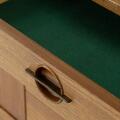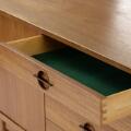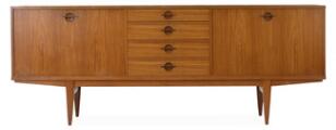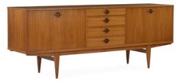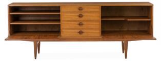 Skænk af teak, front med skuffer og opbevaring. Udført og mærket hos Lyby Møbler. H. 81. B. 261. D. 50.