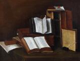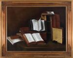 Opstilling med bøger, brev og fjerpen på et bord. Sign. Christian Trolle. Senere betegnet “8”. Olie på lærred. 63×79.