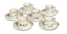 “Flora Danica” six porcelain chocolate cups and saucers decorated in colours and gold with flowers. 3512 and 3513. Royal Copenhagen. (6)