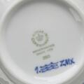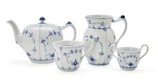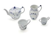 “Musselmalet Riflet” porcelæn, dekoreret i underglasur blå, bestående af seks krus 090, fire barnekopper 075, tekande 142 og mælkekande 442. Royal Copenhagen. (12)