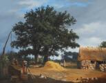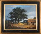 Farm eksterior with a family fetching water from a well. Signed A. Juuel. Oil on wood. 32×41 cm.