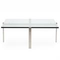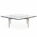 “PK 65”. Kvadratisk sofabord med stel af matforkromet stål og plade af glas. Formgivet 1979. Udført og mærket hos Fritz Hansen, 2014. H. 38. L./B. 100.