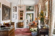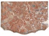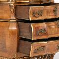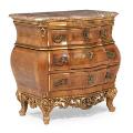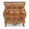 Dansk bombéformet kommode af guldstafferet nøddetræ, front med tre skuffer, plade af broget marmor, beslag af forgyldt bronze, udskåret med rocailler, bladværk og kæmninger. Rokoko form, 20. årh.s begyndelse. H. 74. B. 70. D. 55.