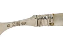 Holger Kyster: Dinner set of silver, comprising dinner knife, dinner fork and soup spoon, handle with openwork decoration in the form of initials. Together with a serving spatula of silver with handle of mother of pearl. Weight excl. dinner knife and serving spatula 135 g. L. 25.2, 22.2 and 20.5 cm. Serving spatula L. 17.8 cm.