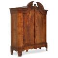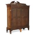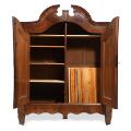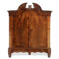 Stort tysk skab af nøddetræ, svungen top, front med to døre bag hvilke senere hylder. Ca. 1850. H. 231. B. 200. D. 75.