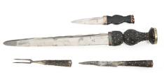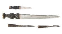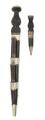 Skotsk victoriansk nysølvmonteret dirk med greb i “basket weave” dekoreret med indlagte stifter og mærket I AM READY ca. 28,5 cm. langt blad i læderskede monteret i nysølv hvori kniv og gaffel samt en nyere sølvmonteret? sgian dubh med ca. 8,8 cm. langt blad i læderskede mærket RA samt SCOTLAND på øverste beslag. (2)