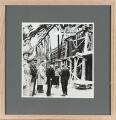Original black-and-white press photograph of British Prime Minister Winston Churchill (1874–1965) during an inspection of German V-1 rocket launch pads near Caen in Normandy on July 22, 1944. Front with cropping instructions in white and pencil (top). Back with agency stamp, handwritten pencil notes, and attached news telegram dated July 28, 1944. Oak frame with double glazing. Light dimensions 19×17 cm. Frame dimensions 28×26 cm.