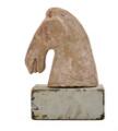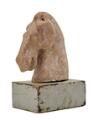 Chinese pottery horse head with remains of red paint. Han dynasty. H. 19 cm. Mounted on a gray painted wooden base.