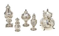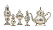 Kaffekande samt fire strøbøsser af sølv. 19.-20. årh. Vægt 1064 g. H. 13–22 cm. (5)
