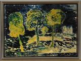 Several peelings especially to the blue paint and the tree in the middle. Some unstable crackles. Small holes along edges originating from previous mounting. Should be restored and stabilized.