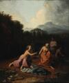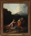 Badende kvinder ved en flodbred, i baggrundet et bjerglandskab. Usigneret. Olie på lærred. 34×29.
