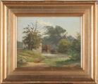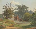 Scenery from the watermill at Christiansfeld. Signed and dated A. Juuel, 1845. Oil on cardboard. 18×21 cm.