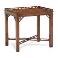 A mahogany side table, decorated with open work carvings and x-shaped base, profiled edges. Manufactured by Georg Kofoed, Copenhagen with label. 20th century. H. 60. L. 61. D. 47 cm.