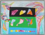 “Lykkens gudinde i Skydetæltet”, 1991. Signeret Lis Zwick 1991. Olie på lærred. 101×140 cm.