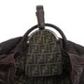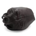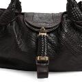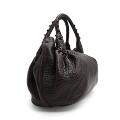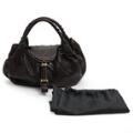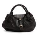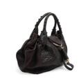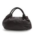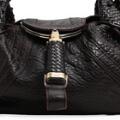 “Spy” af mørkebrunt læder med gyldne beslag, to hanke, integreret møntpung, et rum med monogram for. H. 28. B. 42. D. 13 cm.