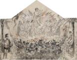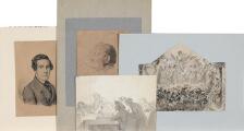 “Bagermester Købke”. Baker Købke. Unsigned. Inscribed Gertner. Ca. 15.5×15.5 cm. The nine muses and a large orchestra celebrating The Arts. Unsigned. Drawing ink and wash heightened with white on paper laid on paper. 20×25.5 cm.