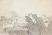 A merry party drinking and enjoying a game of chess. Verso inscribed H. Jerichau. Pencil and watercolour on paper. 16×24 cm.