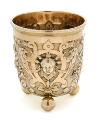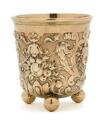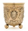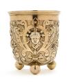 A German Baroque style silver-gilt beaker, richly chased and embossed with cartouches and masks, bird heads, fruit and foliage, bands and garlands, on three ball supports, exterior bottom engraved with the coat of arms of Mecklenburg-Schwerin, surrounded by text “Johann Albrecht H.Z. Mecklenb. 1901”. J. Wagner & Sohn, Berlin, fineness 800. C. 1900. Weight 216 g. H. 9.5 cm. Diam. top 8.5 cm.