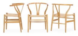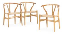 “Wishbone Chair”. Set of three oak armchairs. Seat with woven papercord. Model CH 24. Designed 1949. Manufactured and marked by Carl Hansen & Søn. (3)
