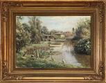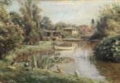 Ænder på bredden i Damhaven Park. Sign. P. Mønsted Damhaven, Vedbæk 1933. Olie på lærred. 35×50 cm.
