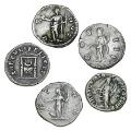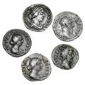 Romerske kejserdømme, 5 denarer, Marcus Aurelius, 161–180, COS III, RIC 215, Faustina II, 147–175, IVNO, RIC 688, SAECVLI FELICIT, RIC 712, Lucilla, 164–182, VENVS, RIC 785, Commodus, 180–192, LIB AVG P M TR P XVII COS VII P P, RIC 241. (5)