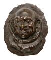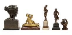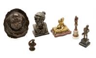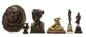 A collection of six various bronze figures, consisting of a relief with a monk's face signed E. Borch 19.5×16 cm. Artemis bust on wooden base H. 15 cm, child sitting on cushion mounted on marble base H. 8 cm, boy with basket, signed H. Eichberg mounted on granite base H. 10 cm, female figure on alabaster pedestal H. total 15.5 cm and a bronze seal H. 7 cm. (6)