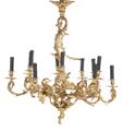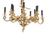 Lysekrone af forgyldt bronze med 12 lysarme, rigt støbt med bladværk. Elektrisk. Rokoko form. 20. årh. H. 92. Diam. 83 cm.