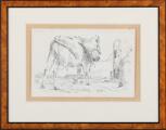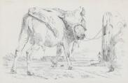 “En tyrekalv bundet til en ledstolpe”. A calf tied to a post. Signed with monogram and dated Kjøbh. Dec. 1844 in print. Etching laid on paper. Sheet size 16 × 24 cm.