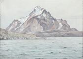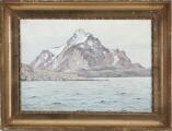 “Kungnait”. Grønlandsk kystparti med udsigt mod fjeldet Kungnait. Sign. Em. A. Petersen “Kungiat” 1921. Olie på lærred. 27,5×37,5 cm.