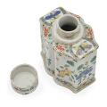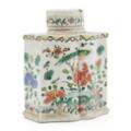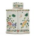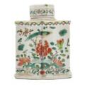 A Chinese famille verte tea caddy of fluted, rectangular form painted with flowers, birds and butterflies. Kangxi 1662–1722. H. 12 cm.