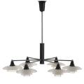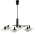 “Stem fitting”. Six branched chandelier. Hexagonal black lacquered metal frame with chromed arms and stem. Bakelite canopy and socket houses, marked “PH lamp” and “Patented”. Mounted with 2/1 frosted glass shades and bottom bowls. Manufactured 1930s by Louis Poulsen. H. 70 cm. Diam. 82 cm.