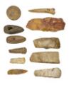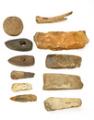 A collection of 11 Danish stone age artefacts consisting of an antler axe, two axes in stone, 5 flint axes, an axe plank, a flint point and a crushing stone.
